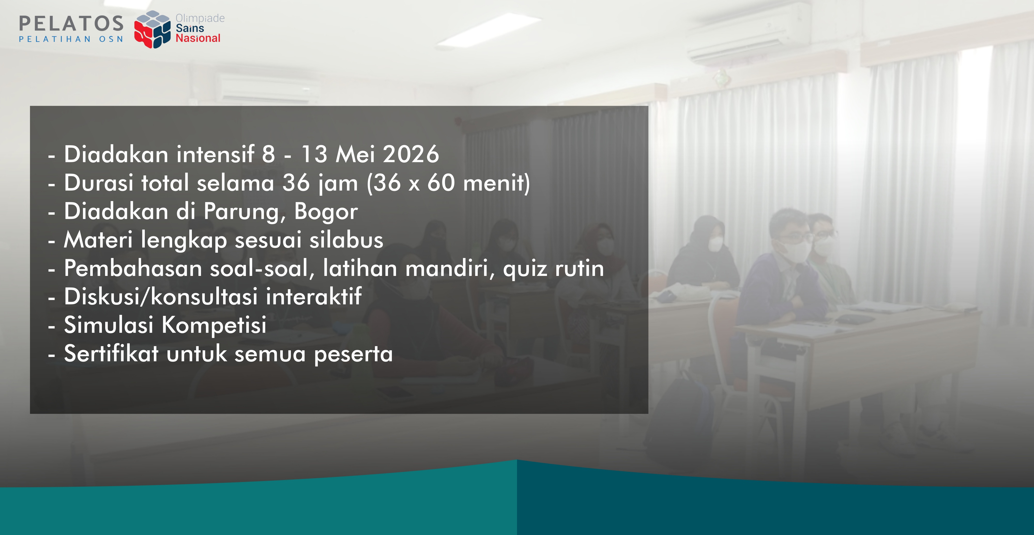 Dalam rangka persiapan menghadapi Olimpiade Sains Nasional tingkat Kota (OSN-K) tahun 2026, kami dari pelatihan-osn.com mengundang siswa/i tim Olimpiade Sains SMA/MA dari berbagai daerah di Indonesia untuk dapat berpartisipasi pada kegiatan Pelatihan Akbar OSN-K 2026, yang diadakan pada tanggal 8 - 13 Mei 2026 di BBGP, Parung, Bogor, Jawa Barat. Pelatihan ini bertujuan untuk mempermantap persiapan sehingga siswa lebih siap untuk menang di OSN-K dan lolos ke OSN-P dan OSN tahun 2026.